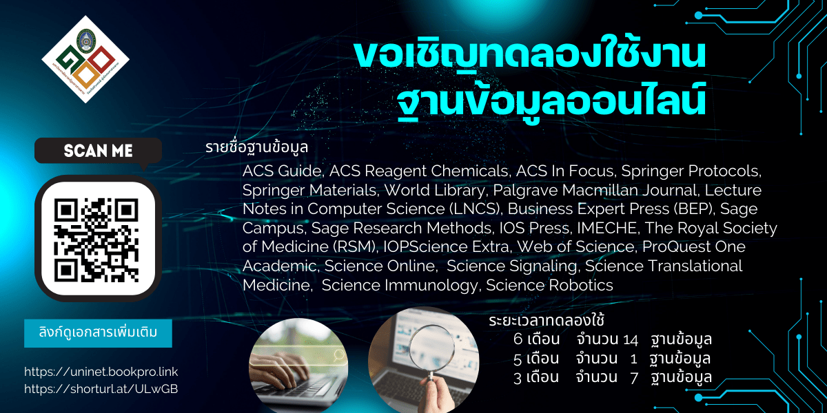 ข่าวประกาศ ขอเชิญทุกท่านทดลองใช้งานฐานข้อมูลออนไลน์ by arit-weerachai พฤษภาคม 20, 2025 ตามที่บริษัท บุ๊ค โปรโมชั่น แอนด์ เซอร์วิส จำกัด ได้ดำเนินการเปิดการทดลองใช้งานฐานข้อมูลปี 2568 เพิ่มเติม ระยะเวลา 6 เดือน ให้กับมหาวิทยาลัยจำนวน 78 แห่งภายใต้สำนักงานปลัดกระทรวงการอุดมศึกษา วิทยาศาสตร์ วิจัย และนวัตกรรม ท่านสามารถเข้าใช้งานที่ได้รวบรวมลิงค์ฐานข้อมูลทดลองใช้ทั้งหมดไว้ที่ https://uninet.bookpro.link หรือสแกนคิวอาร์โค้ด เพื่อดาวน์โหลดโบร์ชัวร์ ดาวน์โหลดข้อมูล วิดีโอ PowerPoint และรายละเอียดต่างๆ ของแต่ละฐานข้อมูลได้ที่ https://shorturl.at/ULwGB Share this post: แนะแนวเรื่อง Previous Book SuggestionsNextห้องสมุดพบคณะวิทย์