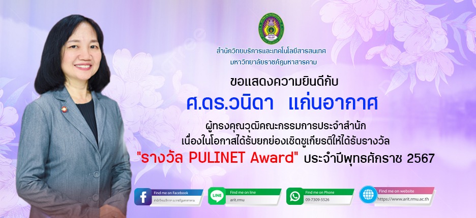 ข่าวประกาศ ขอแสดงความยินดีกับ ศาสตราจารย์ ดร.วนิดา แก่นอากาศ by arit-weerachai ตุลาคม 4, 2024 สำนักวิทยบริการและเทคโนโลยีสารสนเทศ มหาวิทยาลัยราชภัฏมหาสารคาม ขอแสดงความยินดีกับ ศาสตราจารย์ ดร.วนิดา แก่นอากาศผู้ทรงคุณวุฒิคณะกรรมการประจำสำนักเนื่องในโอกาสได้รับยกย่องเชิดชูเกียรติ รางวัล PULINET Award ประจำปีพุทธศักราช 2567 ข่ายงานห้องสมุดมหาวิทยาลัยส่วนภูมิภาค (PULINET) ซึ่งเข้ารับรางวัลในวันที่ 15 มกราคม 2568 ในการประชุมวิชาการระดับชาติ PULINET ครั้งที่ 15 (PULINET 2025) ณ อาคารเฉลิมพระเกียรติ ในโอกาสฉลองพระชนมายุ 5 รอบ 2 เมษายน 2558 มหาวิทยาลัยมหาสารคาม Share this post: แนะแนวเรื่อง Previousปฏิทินวันหยุด ประจำเดือน ตุลาคม พ.ศ.2567Next๘ ตุลาคม ๒๕๖๗วันคล้ายวันประสูติพระเจ้าวรวงศ์เธอ พระองค์เจ้าสิริภาจุฑาภรณ์