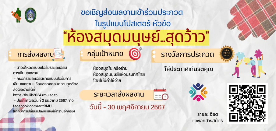 ข่าวประกาศ ประกวดโปสเตอร์ “ห้องสมุดมนุษย์..สุดว้าว” by arit-weerachai ตุลาคม 24, 2024 Share this post: แนะแนวเรื่อง Previous๘ ตุลาคม ๒๕๖๗วันคล้ายวันประสูติพระเจ้าวรวงศ์เธอ พระองค์เจ้าสิริภาจุฑาภรณ์